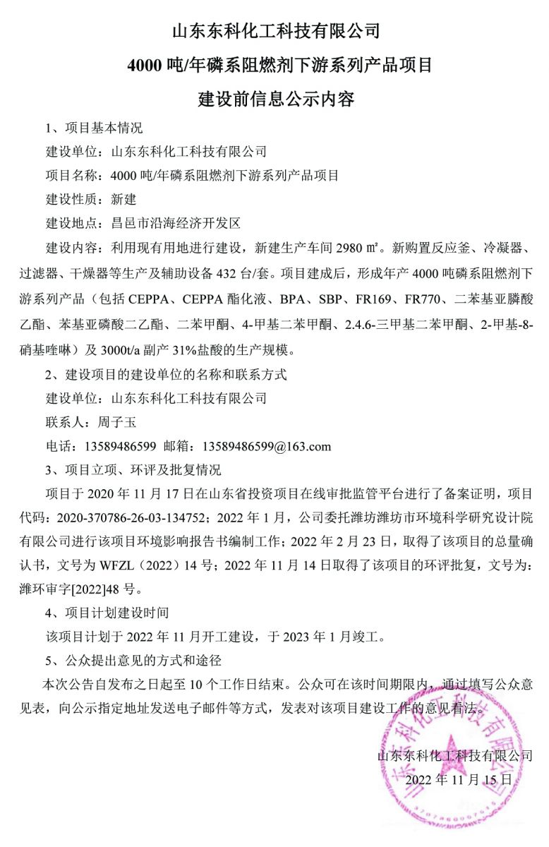 山东东科化工科技有限公司4000 吨/年磷系阻燃剂下游系列产品项目建设前信息公示